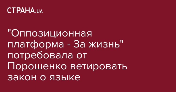 Партия "Оппозиционная платформа - За жизнь" потребовала от пока еще действующего президента Украины Петра Порошенко ветировать так называемый "закон о тотальной украинизации", поскольку он нарушает Конституцию Украины и права ее граждан. Соответствующе заявление опубликовано на странице политсилы.