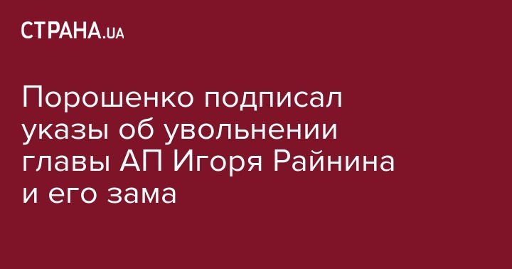 Президент Украины Петр Порошенко, который уже завтра покинет свой пост, 19 мая уволил подавшего в отставку главу АП Игоря Райнина. Об этом свидетельствует информация на сайте главы государства.