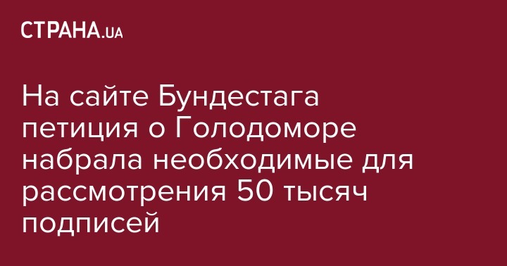 На сайте парламента Германии петиция о признании Голодомора 1932-1933 годов геноцидом украинского народа набрала более 50 000 подписей и теперь Бундестаг должен ее рассмотреть. Об этом сообщается на странице МИД Украины в Facebook.