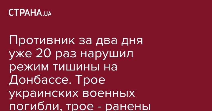 Во вторник, 4 июня, противник 16 раз нарушил режим прекращения огня на Донбассе и обстрелял украинские позиции, погибли двое военнослужащих ВСУ. Об этом идет речь в сообщении пресс-службы штаба ООС на странице в Facebook.