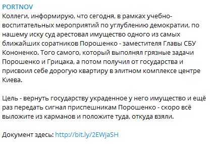"Коллеги, информирую, что сегодня, в рамках учебно-воспитательных мероприятий по углублению демократии, по нашему иску суд арестовал имущество одного из самых ближайших соратников Порошенко - заместителя Главы СБУ Кононенко. Того самого, который выполнял грязные задачи Порошенко и Грицака, а потом получил от государства и присвоил себе дорогую квартиру в элитном комплексе центре Киева", - отметил Портнов.