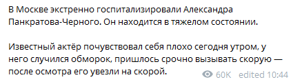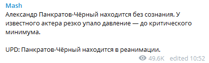 Сообщается, что у Панкратова-Черного до критического минимума упало давление. Он находится в реанимации без сознания.