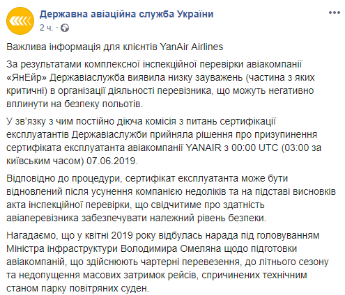 Согласно результатам комплексной инспекционной проверки авиакомпании "YanAir Airlines" в Государственной авиационной службе Украины приняли решение приостановить сертификат эксплуатанта авиакомпании YANAIR с 00:00 UTC (03:00 по киевскому времени) 7 июня.