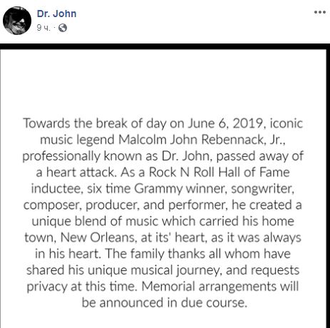 "6 июня 2019 года легендарный музыкант Малколм Джон Ребеннэк-младший, известный под профессиональным псевдонимом Доктор Джон, умер от сердечного приступа. Член Зала славы рок-н-ролла, шестикратный обладатель музыкальной премии Grammy, автор песен, композитор, продюсер и исполнитель создал уникальный музыкальный стиль, проникнутый духом его родного города Новый Орлеан",- говорится сообщении.
