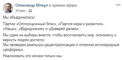 "Мы объединились! Партии "Оппозиционный блок", "Партия мира и развития", "Наши", "Видродження" и "Доверяй делам". Мы идем на выборы вместе, чтобы восстановить мир, экономику и вернуть людям достаток. Мы проведем реальную децентрализацию и отменим антинародные "реформы". Реализовать это можем только мы", - написал Александр Вилкул.