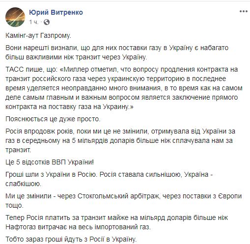 По его словам, "Нафтогаз" сейчас покупает дешевле в Европе, чем Газпром предлагает "со скидкой". "Напоследок, напомню господину Миллеру, что Газпром с апреля 2018 года не выполняет свои контрактные обязательства по поставке газа в Украину. И поэтому через новый арбитраж в Стокгольме мы заставим Газпром заплатить за это сотни миллионов долларов", - подытожил Витренко.