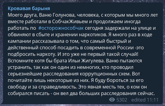 телеведущая Ксения Собчак заявила, что неоднократно говорила, что именно подбрасывание наркотиков является самым быстрым и простым способом устранить неугодного человека, и его регулярно используют. По ее словам, Голунов вел серьезные расследования фактов коррупции в Москве, и только перед задержанием занимался сразу двумя делами, и ему регулярно угрожали.