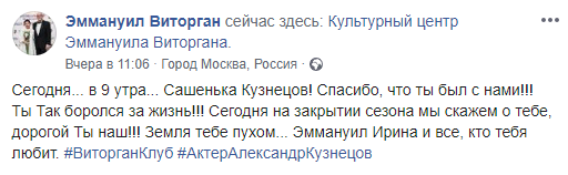 "Сегодня в 9 утра. Сашенька Кузнецов! Спасибо, что ты был с нами! Ты так боролся за жизнь! Сегодня на закрытии сезона мы скажем о тебе, дорогой ты наш!!! Земля тебе пухом", — написал Эммануил Виторган.