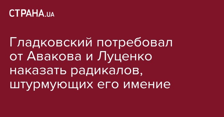 Главный фигурант коррупционного скандала в Укроборонпроме экс-замсекретаря СНБО Олег Гладковский потребовал от главы МВД Арсена Авакова и генпрокурора Юрия Луценко "навести порядок и наказать" радикально настроенных молодых людей, в очередной раз штурмующих его жилой дом, передает Интерфакс-Украина.