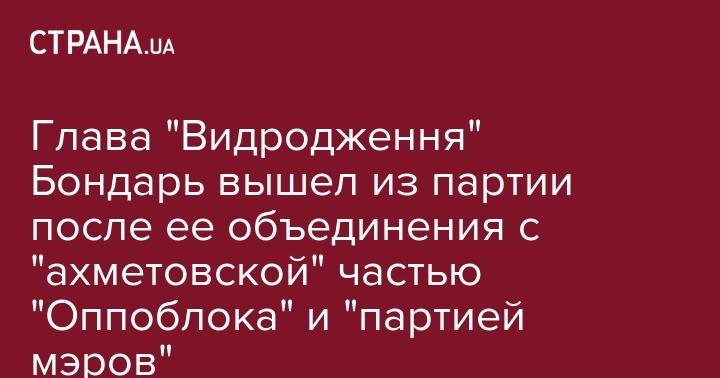 Лидер партии "Видродження" Виктор Бондарь сообщил, что написал заявление о выходе из политической силы и слагает полномочия ее председателя. Об этом он написал на своей странице в Facebook.