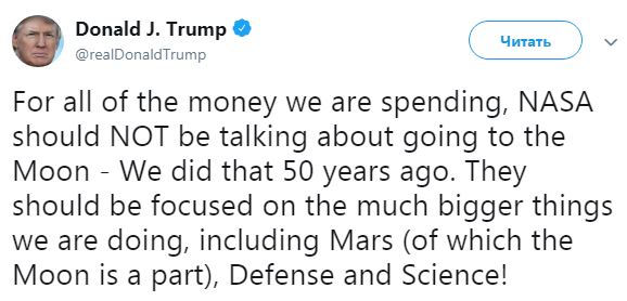 "Несмотря на все деньги, которые мы тратим, NASA не должно говорить о полете на Луну — мы сделали это 50 лет назад. Они должны быть сосредоточены на гораздо больших вещах, которые мы делаем, в том числе на Марсе (частью которого является Луна), обороне и науке!" - написал Трамп.