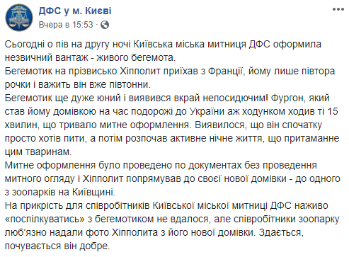 В украинский зоопарк доставили маленького бегемота по кличке Хипполит, которого привезли из Франции. Об этом в Facebook сообщает пресс-служба Государственной фискальной службы.