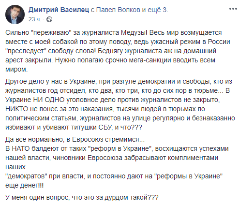 Бывший заключенный украинский журналист Дмитрий Василец, который два года просидел в СИЗО, написал, что зато в Украине, при разгуле демократии и свободы, ни одно уголовное дело против журналистов не закрыто и никто не понес за это наказания.