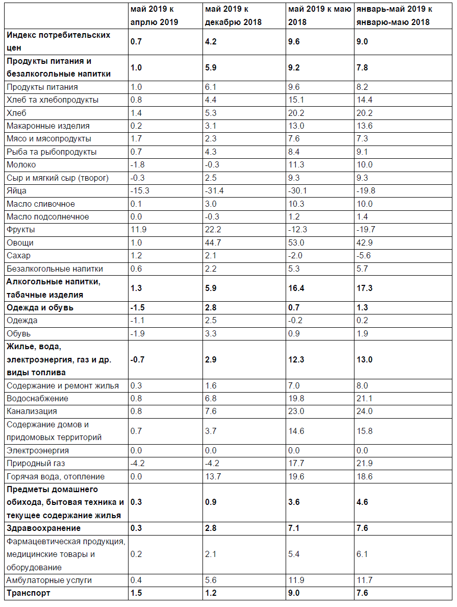 Продукты питания в Украине за май 2019 года подорожали на 1,0%. Больше всего выросли в цене фрукты - на 11,9%. Яйца подешевели на 15,3%. Цены на алкогольные напитки и табачные изделия выросли на 1,3%, на одежду и обувь - снизились на 1,5%. Жилье, вода, электроэнергия, газ и другие виды топлива подешевели на 0,7%.