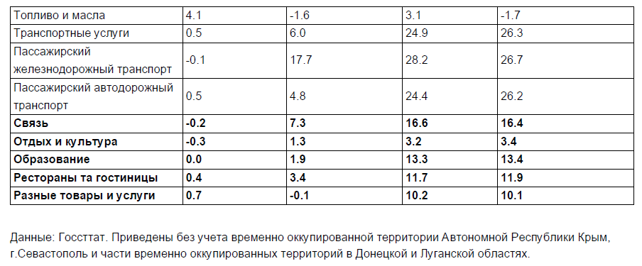 Предметы домашнего обихода и бытовая техника подорожали на 0,3%, здравоохранение на 0,3%, транспорт на 1,5% (в т.ч. топливо на 4,1%), на связь цены снизились на 0,2%, отдых и культура подешевели на 0,3%, образование не изменилось - 0,0%, рестораны и гостиницы подорожали на 0,4%.