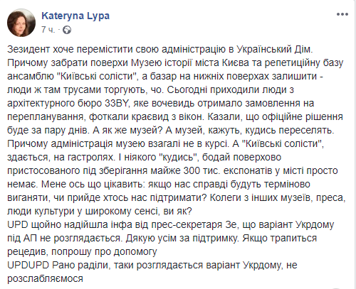 До этого журналистка, сотрудница Музея истории города Киева Катерина Липа написала в Facebook, что о планах переезда АП в Украинский дом сотрудникам музея стало известно случайно: "сегодня приходили люди из архитектурного бюро 33BY, которое очевидно получило заказ на перепланировку, фоткали вид из окон. Говорили, что официальное решение будет за пару дней".