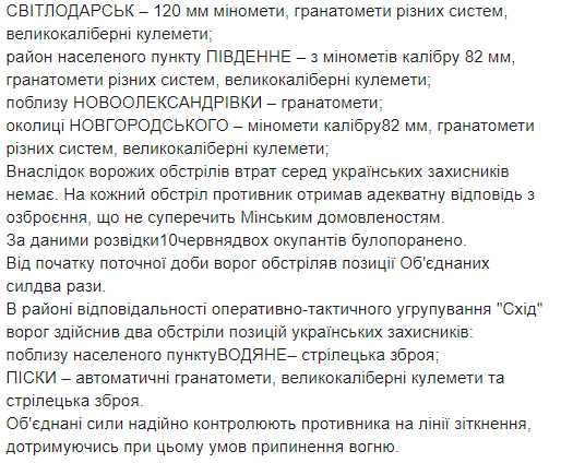 Уточняется, что речь идет об обстрелах из минометов калибра 120 и 82-мм, гранатометов различных систем, крупнокалиберных пулеметов и стрелкового оружия. "Вследствие вражеских обстрелов потерь среди украинских защитников нет. На каждый обстрел противник получил адекватный ответ по вооружению, не противоречащий Минским договоренностям", – говорится в сообщении на официальной странице штаба ООС в соцсети Facebook.