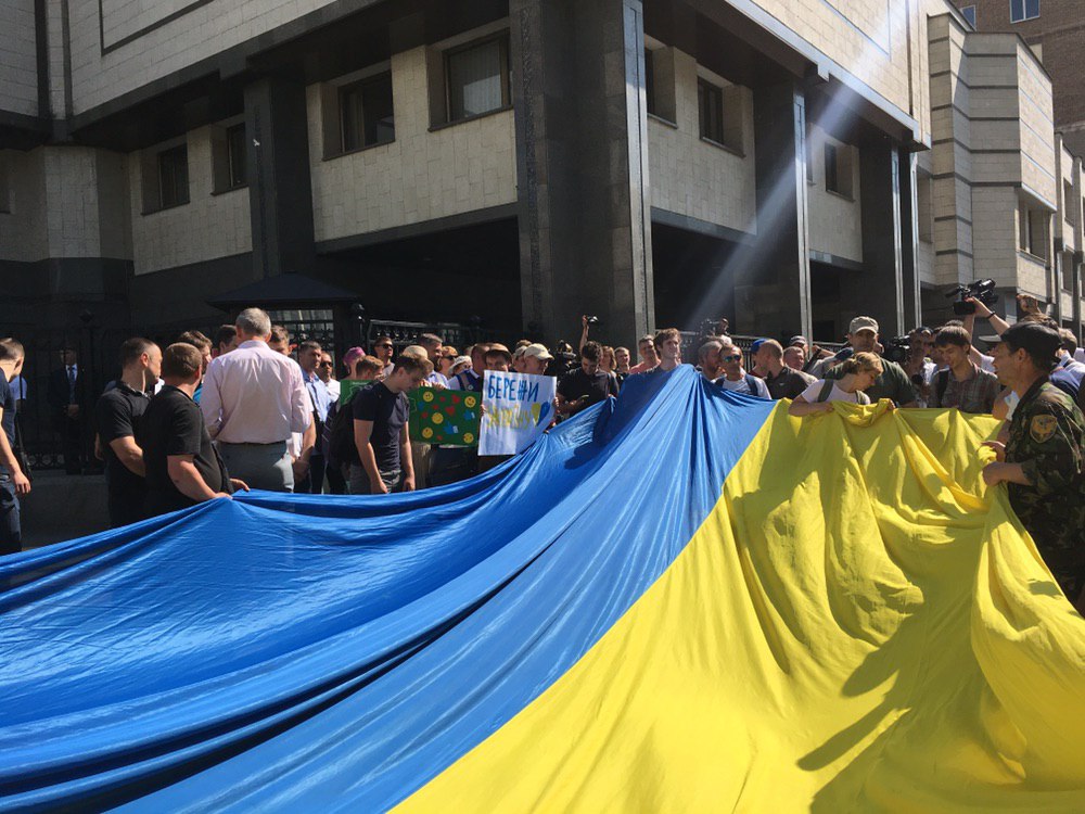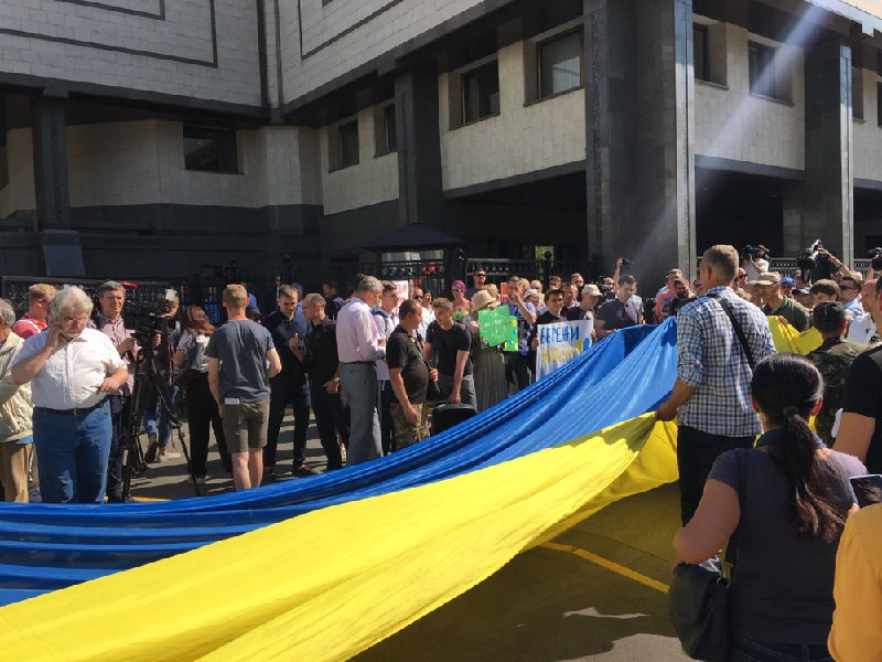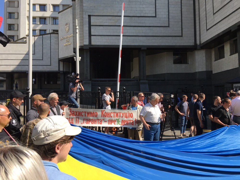 Собравшиеся развернули флаги Украины, спели гимн и скандируют "Банду геть!" Также люди держат в руках плакаты с надписями "Нет конституционному перевороту", "Зеленский, не порочь Конституцию!", "Береги Украину, КСУ!"