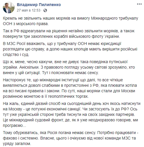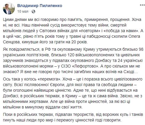 10 мая, после праздника, Пилипенко написал: "Наш северный сосед использует тему войны, смертей миллионов людей в мировых войнах для "повторим" и "победа за нами". А в это время, ровно пять лет назад в мае эти победоносцы схватили Олега Сенцова, бросив его в тюрьму на 20 лет.