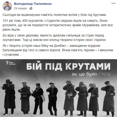 Не преминул Пилипенко покритиковать РФ и в годовщину боя под Крутами: "101 год назад 400 курсантов и студентов сознательно шли на смерть. Они понимали, что им не победить четырехтысячную армию Муравьева, но все равно шли.