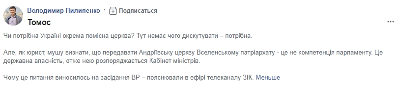 Также Пилипенко выступал за ПЦУ: "Нужна ли Украине отдельная поместная церковь? Здесь нечего обсуждать - нужна".