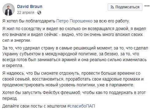 "Я хотел бы поблагодарить Петро Порошенко за всю его работу", - писал он 22 апреля. Он отметил, что "жил по соседству и видел во сколько он (Петр Порошенко - прим. ред.) возвращался домой" и волонтеру было "видно, что он очень много вложил своих сил и энергии".