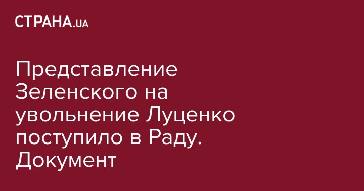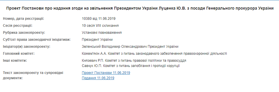 В Верховную Раду поступило представление президента Украины Владимира Зеленского о даче согласия на увольнение Юрия Луценко с поста генерального прокурора страны. Соответствующий проект постановления (№10380) зарегистрирован во вторник.