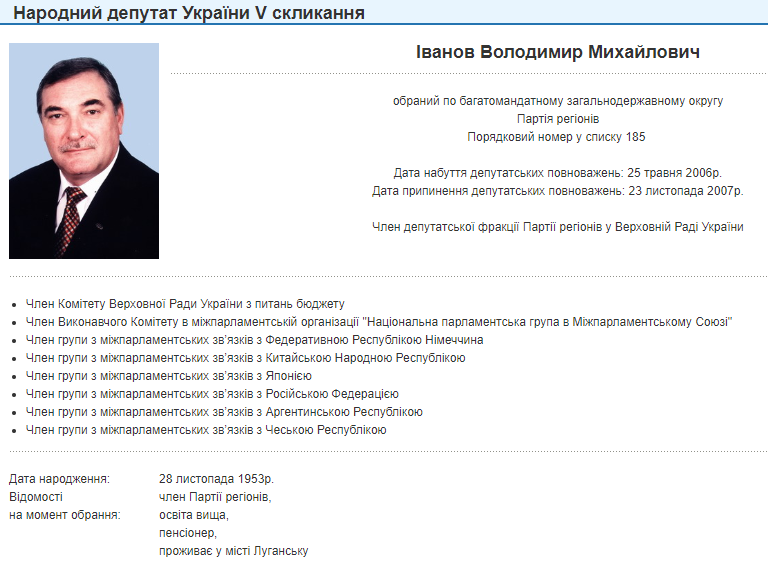 Правда, в 2010 году, когда президентом стал Виктор Янукович, Иванов-старший потерял партийную должность. И в следующую Раду тоже не попал. Зато снова всплыл уже при новой власти. В 2016 году глава Луганской военно-гражданской администрации Юрий Гарбуз назначил его своим советником.