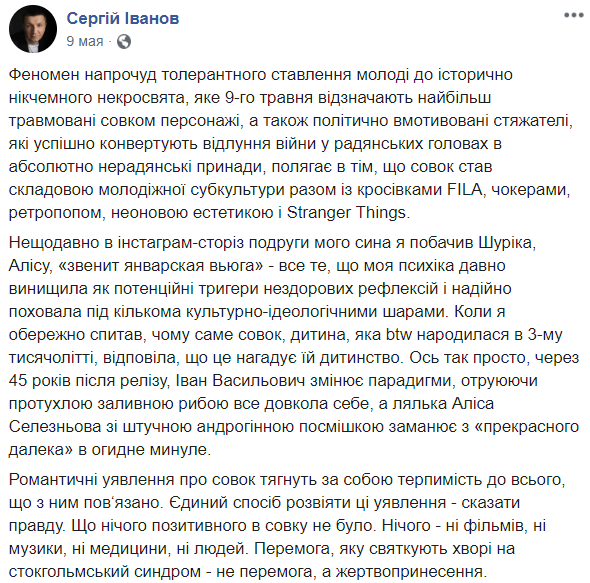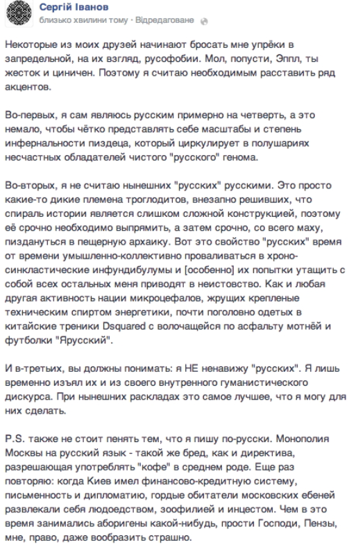 "Я считаю, что этот город (Луганск), изначально люмпенский, получает то, что по сути дела заслужил. Здесь очень много необразованных людей, в которых дали всходы идеи великоросского шовинизма, навязываемые радикальными идеологическими российскими сектами Кургиняна, Дугина со всеми его движениями", - написал Иванов в июле 2014 года в разгар боев за Луганск, когда город находился под обстрелами без воды и электричества.