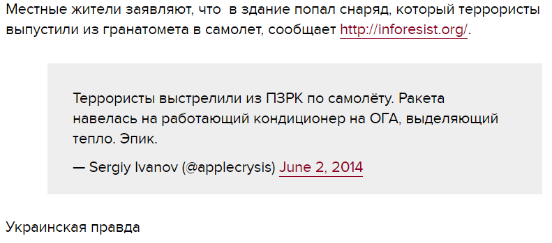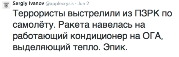 Или "Зеркало недели". "По версии луганского журналиста и блогера Сергея Иванова, террористы выстрелили из ПЗРК по самолёту, однако ракета навелась на работающий кондиционер на ОГА, выделяющий тепло", - написало издание.