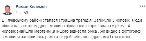 Также активист Роман Келемен пишет в Facebook, что люди поехали на заготовку дров, машина сорвалась с горы и упала в реку. По его данным, четырех мужчин нашли мертвым, а пятого отнесла река. "Как видно из фотографии, с машины осталась рама, а людей смешало с дровами и грязью", - сообщает активист и приводит жуткие фото.