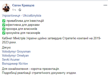 По словам Кравцова, в итоге преобразований УЗ станет привлекательной для инвестиций, а также эффективной для государства, прозрачной для собственников и понятной для пассажиров.
