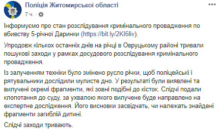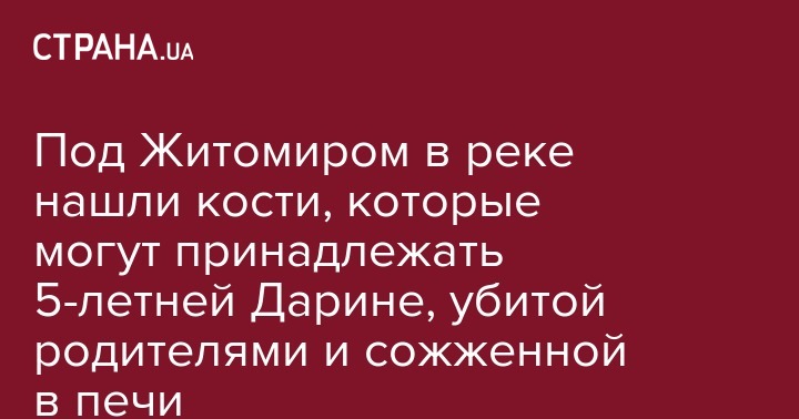 В Житомирской области на дне реки правоохранители обнаружили останки, похожие на кости. Они могут принадлежать 5-летней убитой родителями девочке Дарине Макарчук. Об этом региональное ГУ Нацполиции сообщает на своей странице в соцсети.