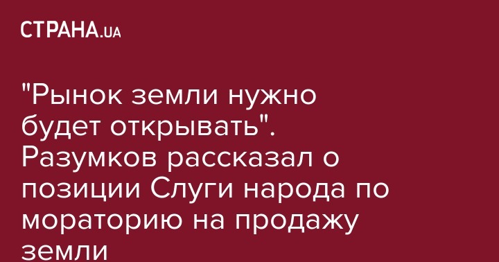 На вопрос о том, какова позиция партии Слуга народа по снятию моратория на продажу земли сельхозназначения и будет ли ваша фракция голосовать за отмену этого моратория, Разумков ответил: "рынок земли нужно будет открывать. Мораторий накладывается из года в год, потому что это выгодно. Нужно, чтобы владельцы земли могли ею пользоваться. Появится законодательная база. Ребята сейчас работают над этим. С одной стороны необходимо защитить национальные интересы, а с другой - собственника".