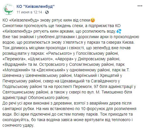 В парках, скверах и на некоторых улицах Киева установили арки, распыляющие прохладную воду, чтобы помочь киевлянам и гостям города справиться с жарой, накрывшей город. Об этом сообщается на официальной странице "Киевзеленстроя" в Facebook.
