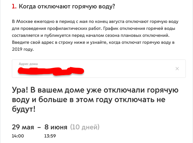 Есть еще одна востребованная опция - получение информации, когда дома у гражданина летом будет отсутствовать горячая вода, вплоть до часа (в реальности горячую воду отключают строго по этому графику).