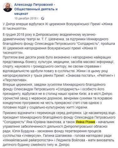 Кстати, сам Петровский еще в 2018 отмечал Резник в своем сообщении о церемонии вручения Всеукраинской премии "Женщина III тысячелетия", которая вручается "лучшим представительницам бизнеса, культуры, медицины, СМИ, спорта, научного и общественного сектора, которые своими делами и ответственностью получили уважение в обществе". "Приятно отметить и победительниц среди днепрянок. Это... Янина Резник - начальник управления обеспечения деятельности Днепропетровскго облсовета", - написал, в частности, бизнесмен о победителях мероприятия, который организовал его благотворительный фонд. Впрочем, в какой номинации наградили Резник он не указал.