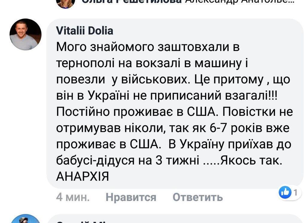 "Т.е. со всех учетов тут он снят. Постоянно проживал в Америке. Естественно, никаких повесток он получать не мог. Приехал на три недели навестить родных. Стоял на вокзале, когда к нему подошли трое в военной форме. Затолкали в машину и повезли в военкомат, там же провели медкомиссию. И отправили в Яворив Львовской области. Сначала намекали, что можно порешать вопрос за 1500 долларов, а когда отец поднял шум, то принципиально уже ничего не решали. Теперь он служит во Львове", -  дополнил Виталий.