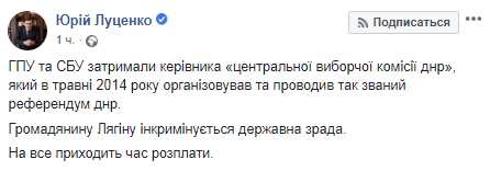 Генпрокуратура и СБУ сегодня, 14 июня, задержали руководителя "Центральной избирательной комиссии ДНР". Об этом сообщил в своем Facebook генпрокурор Юрий Луценко.