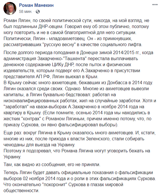 В Крыму сейчас много ахметовцев, бежавших из Донбасса в 2014 году. Лягин оказался среди своих. Однако. Многие из ахметовцев вывезли капиталы, а Лягин буквально бедствовал: работал на низкоквалифицированных работах, жил на случайные заработки. Хотя и "заработал" на квази-выборах А.Захарченко в ноябре 2014 года на квартиру в Крыму", - рассказал Манекин.