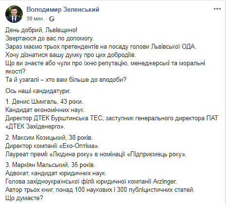 "Обращаюсь к вам за помощью. Сейчас есть три претендента на должность главы Львовской ОГА. Хочу узнать ваше мнение об этих господах. Что вы знаете или слышали об их репутации, менеджерских и моральных качествах? Да и вообще – кто вам больше нравится?", - написал Зеленский.