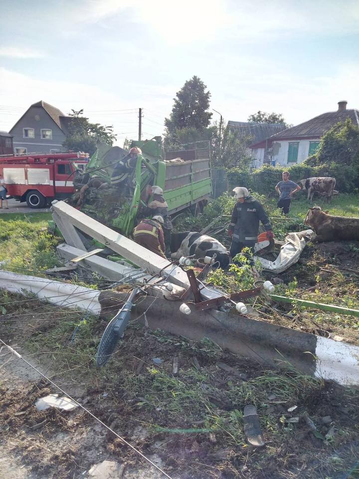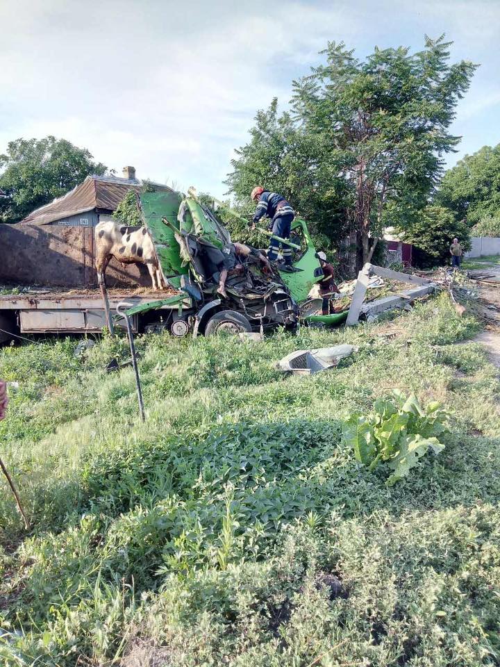 "По прибытию спасателей на место происшествия было установлено, что во время движения водитель грузового автомобиля, перевозивший рогатый скот, не справился с управлением автомобилем и совершил столкновение с опорой электросети", - говорится в сообщении.
