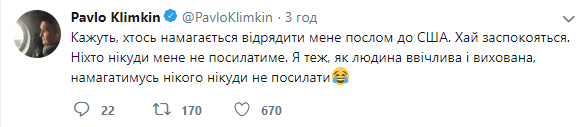 "Говорят, кто-то пытается отправить меня послом в США. Пусть успокоятся. Никто никуда меня не будет посылать", – написал Климкин на своей странице в микроблоге Твиттер в пятницу.