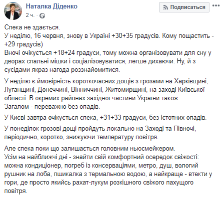 "Жара не сдается. В воскресенье, 16 июня, снова в Украине +30...+35 градусов. Кому повезет - +29 градусов. Ночью ожидается +18...+24 градуса, поэтому можно организовывать для сна во дворах спальные мешки и социализироваться, легче дыша. Ну, и с соседями как раз возможность раззнакомиться", - написала Наталья Диденко.