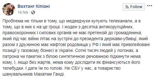 "Проблема не только в том, что медведчуки покупают телеканалы, а в том, что у них есть на это деньги (видимо, имеется ввиду покупка телеканала ZIK соратником одного из лидеров "Оппозиционной платформы - За жизнь" Виктора Медведчука Тарасом Козаком - Прим.Ред.)", - пишет Кипиани.
