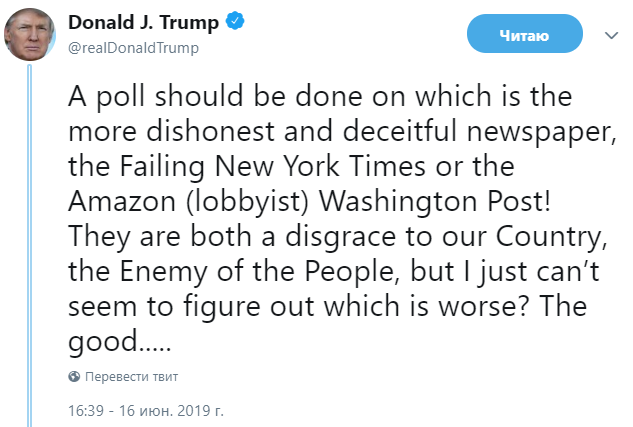 "Верите ли вы, что лживая The New York Times только что опубликовала статью о том, что США значительно усиливают кибератаки на Россию? Это виртуальный акт измены некогда великой газеты, отчаянно нуждающейся в истории, любой истории, даже если она плоха для нашей страны", - написал Трамп в Twitter.