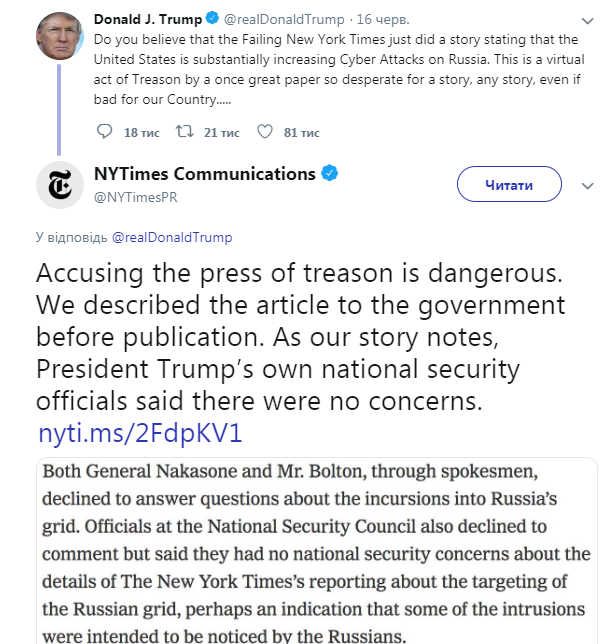 Напомним, что в статье The New York Times, опубликованной в субботу, 15 июня, утверждается со ссылкой на источники, что Вашингтон в течение последнего года участил попытки внедрить в энергосистему России вредоносное программное обеспечение. С его помощью США якобы могут собирать информацию о российской энергосистеме, а также, предположительно, отключить какие-то ее элементы. Трамп в субботу в Twitter опроверг утверждения газеты. Он также обвинил ее в "фактической госизмене" и причинении вреда интересам США.