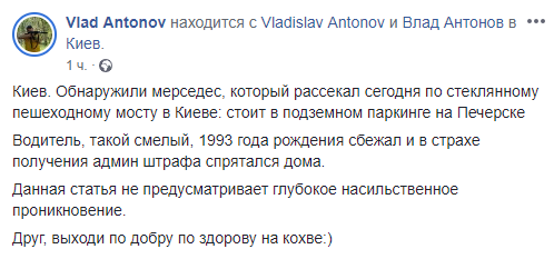 В Киеве был обнаружен автомобиль марки Mercedes, который сегодня заехал на стеклянный пешеходный мост. Об этом сообщил журналист Влад Антонов на своей странице в Facebook.