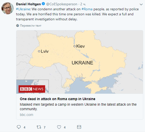 Совет Европы осудил нападение на лагерь ромов во Львове. Об этом написал пресс-секретарь генсека Совета Европы Даниэль Гольтген в своем Twitter.