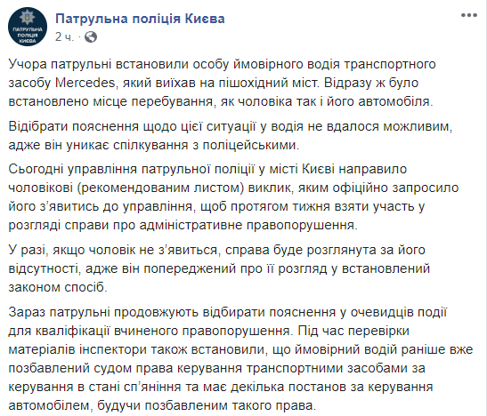 Место пребывания мужчины и его автомобиля было сразу же установлено (водитель сбежал из страха получить административный штраф и припарковал авто в подземном паркинге на Печерске). Однако получить объяснения по этой ситуации полицейским не удавалось, так как водитель избегает общения с правоохранителями.